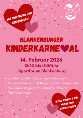 Am 14. Februar 2026 laden wir alle kleinen Närrinnen und Narren herzlich zu unserem bunten Kinderkarneval ins Sportforum Blankenburg ein!